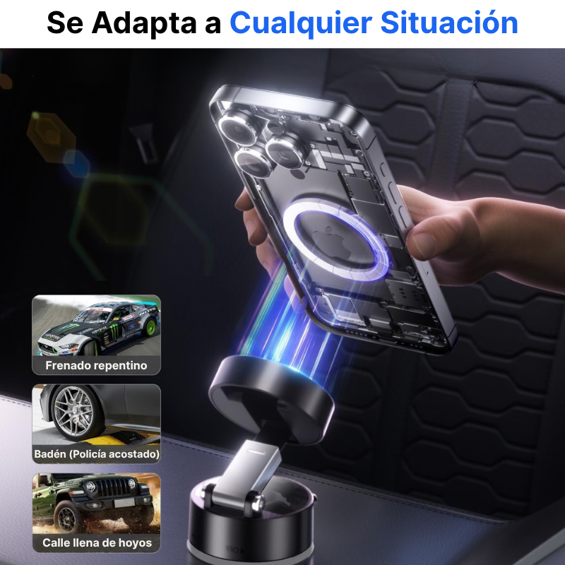 Su sistema magnético MagSafe (incluye aro para Android/no-MagSafe) se pega en 1 segundo, y la ventosa de vacío reforzada crea un sello firme en superficies lisas.